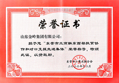 2021年4月,東營市工商業(yè)聯(lián)合會(huì)授予山東金嶺集團(tuán)有限公司“東營市工商聯(lián)抗擊新冠肺炎疫情先進(jìn)集體”、“東營市工商聯(lián)東西部扶貧協(xié)作和對口支援先進(jìn)集體”、“東營市百企幫百村精準(zhǔn)扶貧行動(dòng)先進(jìn)集體”榮譽(yù)稱號,以表彰公司發(fā)展不忘回饋社會(huì)、踐行企業(yè)社會(huì)責(zé)任的可貴精神。公司在多年來的發(fā)展歷程中,始終不忘創(chuàng)業(yè)初心,積極參與愛老敬老、捐資助學(xué)、扶貧濟(jì)困、慈善賑災(zāi)、幫扶農(nóng)村建設(shè)等活動(dòng),為各項(xiàng)公益事業(yè)發(fā)展做出了突出貢獻(xiàn)。