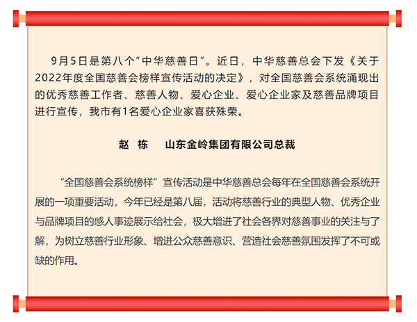 2023年9月5日是第八個“全國慈善會系統(tǒng)榜樣”宣傳活動暨第八個“中華慈善日”,中華慈善總會下發(fā)《關(guān)于2022年度全國慈善會榜樣宣傳活動的決定》,對全國慈善會系統(tǒng)涌現(xiàn)出的優(yōu)秀慈善工作者、慈善人物、愛心企業(yè)、愛心企業(yè)家及慈善品牌項(xiàng)目進(jìn)行宣傳,金嶺集團(tuán)總裁趙棟喜獲“全國慈善會系統(tǒng)榜樣”稱號。