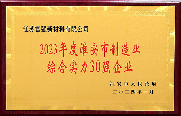 2024年2月18日,在淮安市委市政府召開的全市重特大項(xiàng)目攻堅(jiān)暨優(yōu)化營商環(huán)境大會(huì)上,江蘇富強(qiáng)新材料有限公司被評(píng)為“2023年度淮安市制造業(yè)綜合實(shí)力30強(qiáng)企業(yè)”。