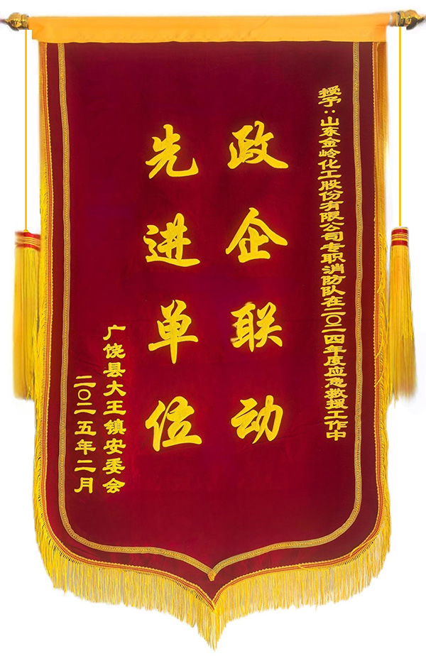 2025年3月12日,為表揚(yáng)山東金嶺化工股份有限公司專職消防隊(duì)積極響應(yīng)政企聯(lián)動(dòng)機(jī)制,在應(yīng)急救援工作中做出的突出成績(jī),廣饒縣大王鎮(zhèn)安委會(huì)授予公司“政企聯(lián)動(dòng)先進(jìn)單位”錦旗。